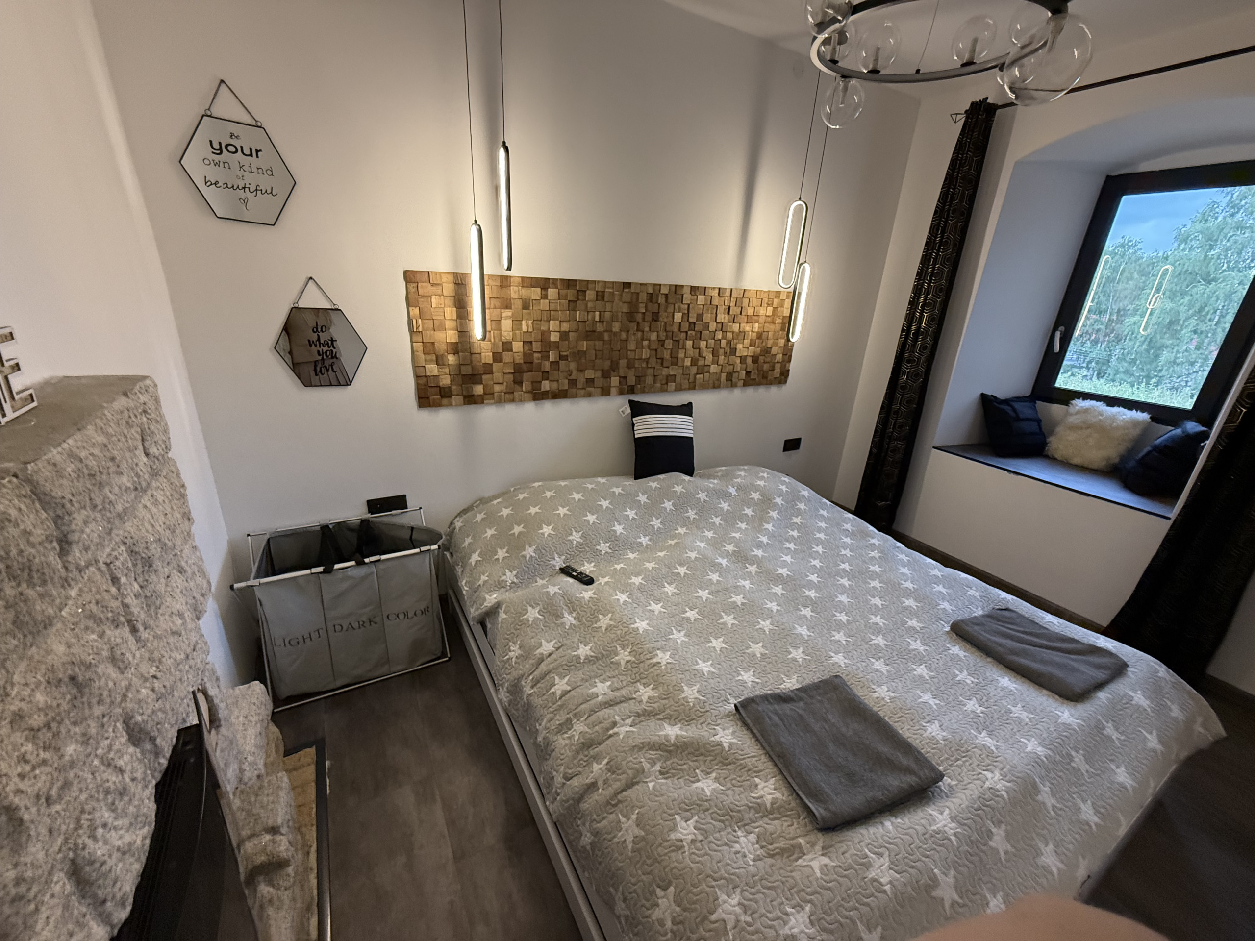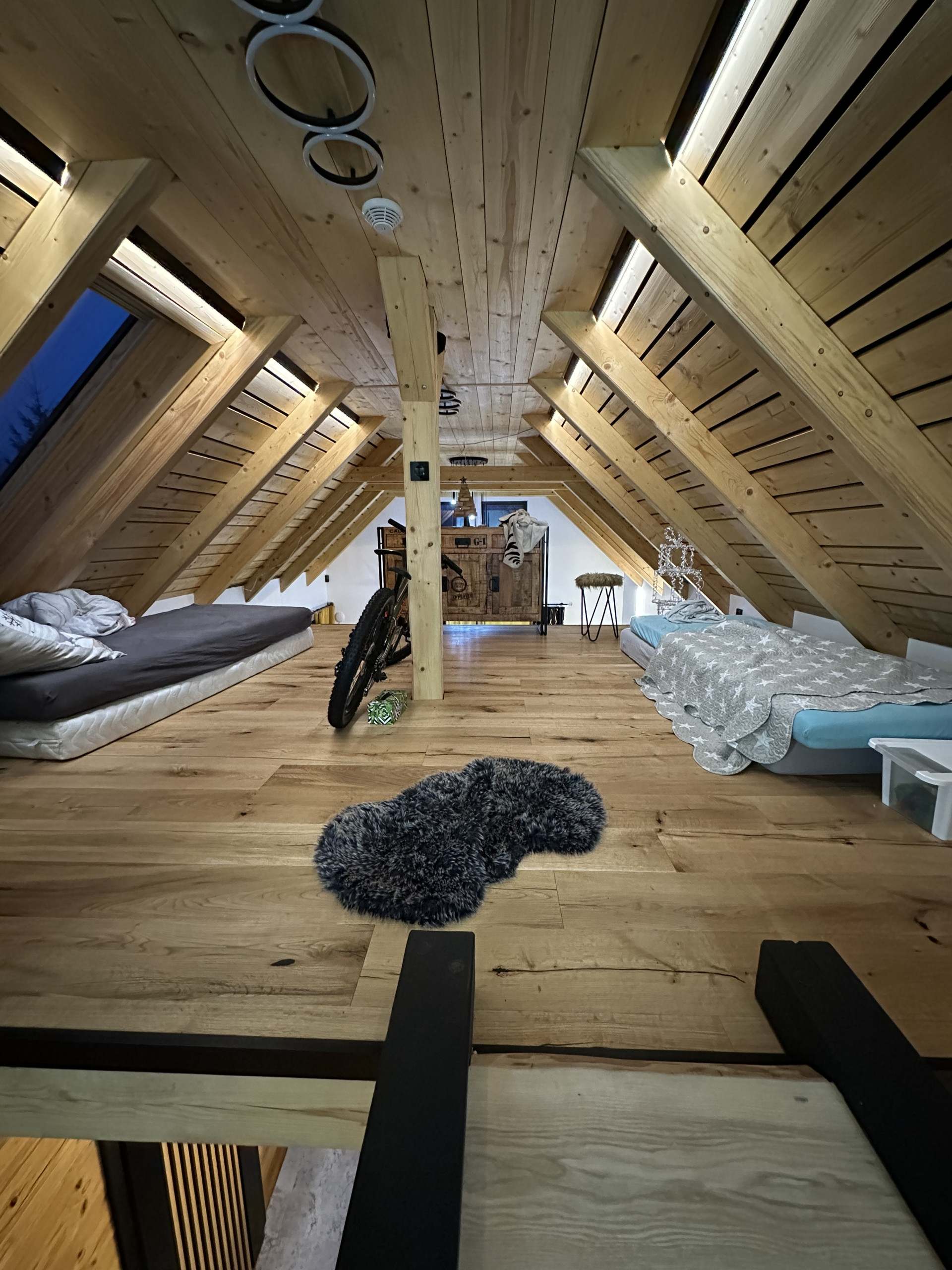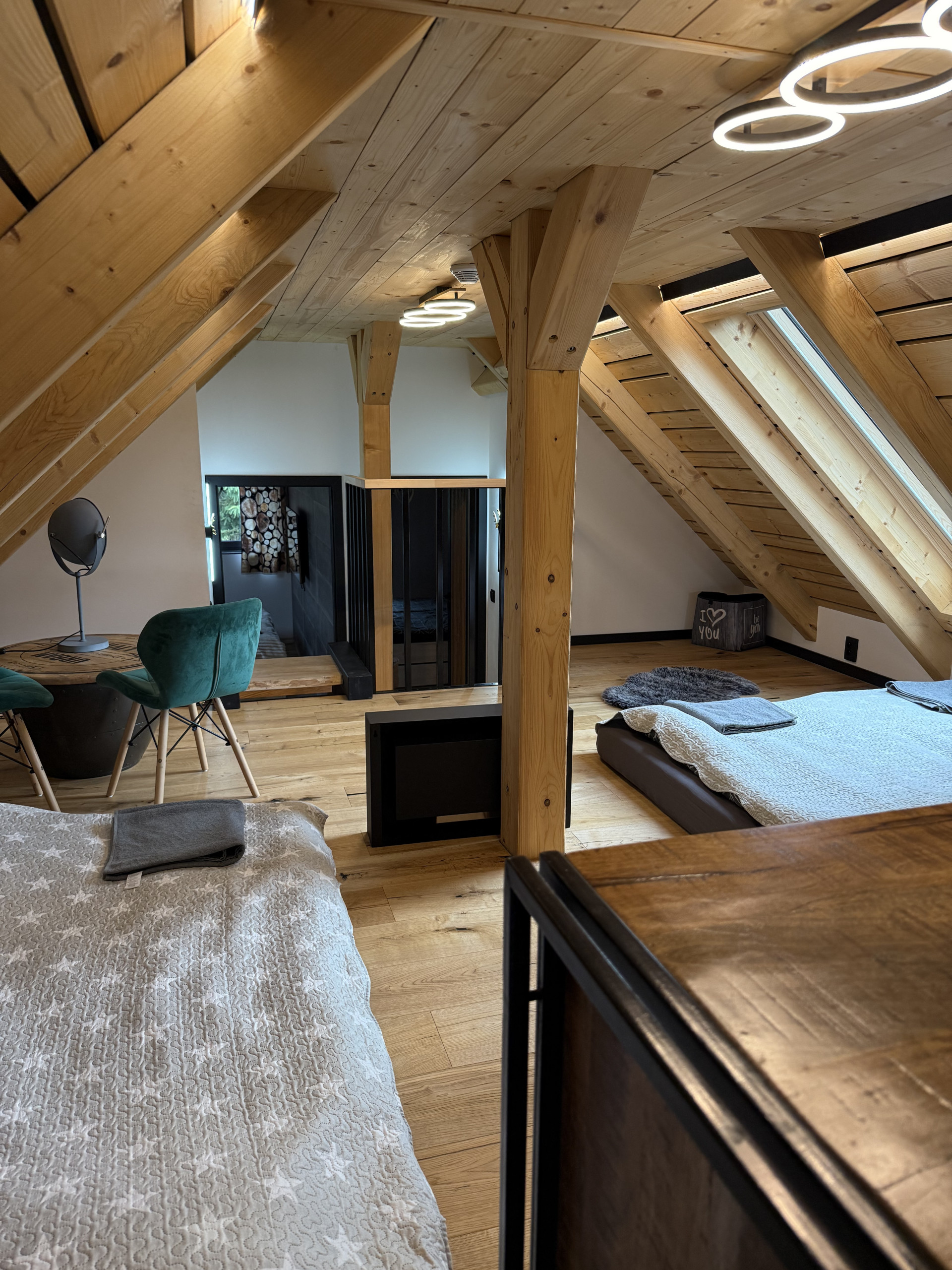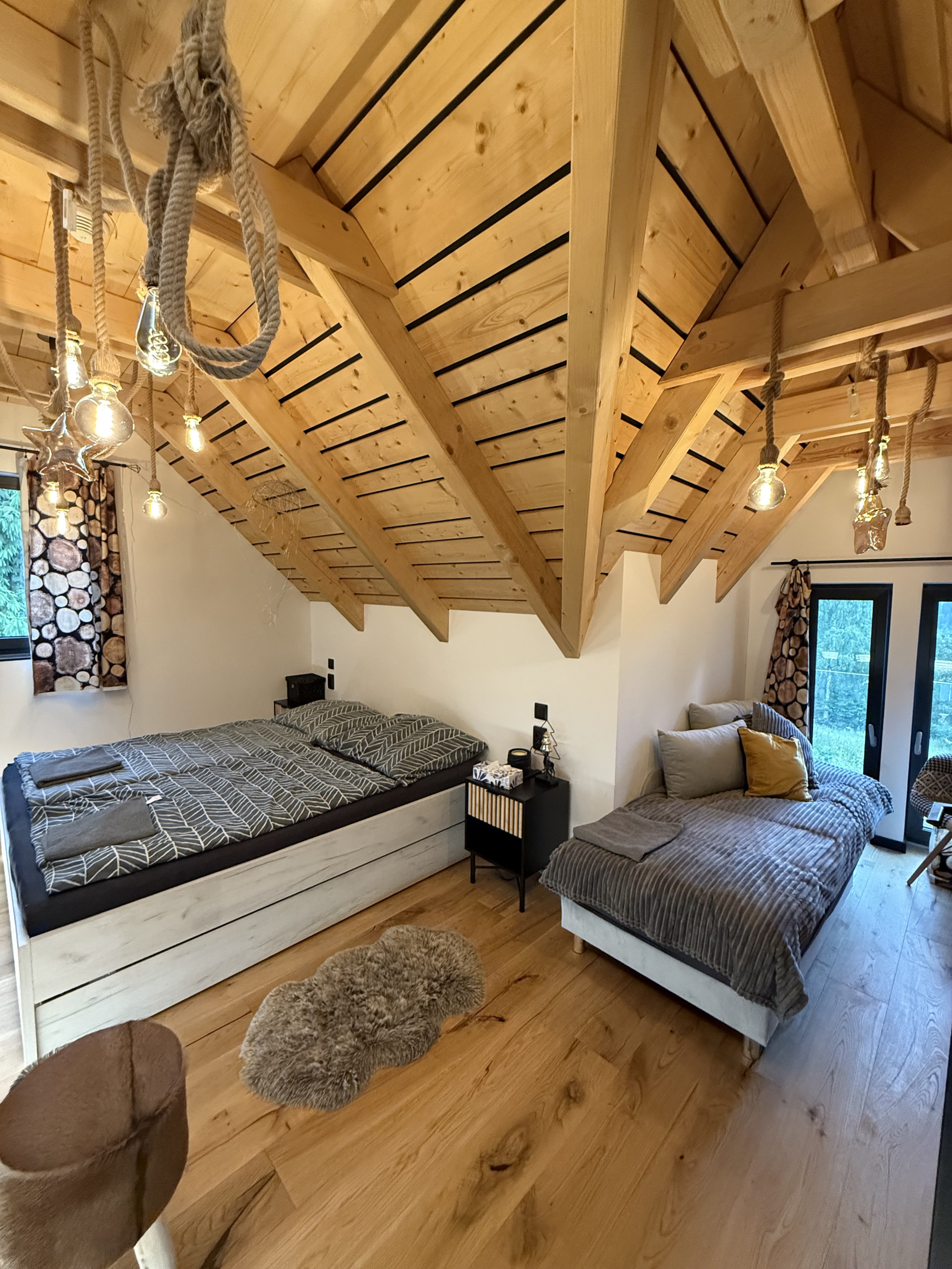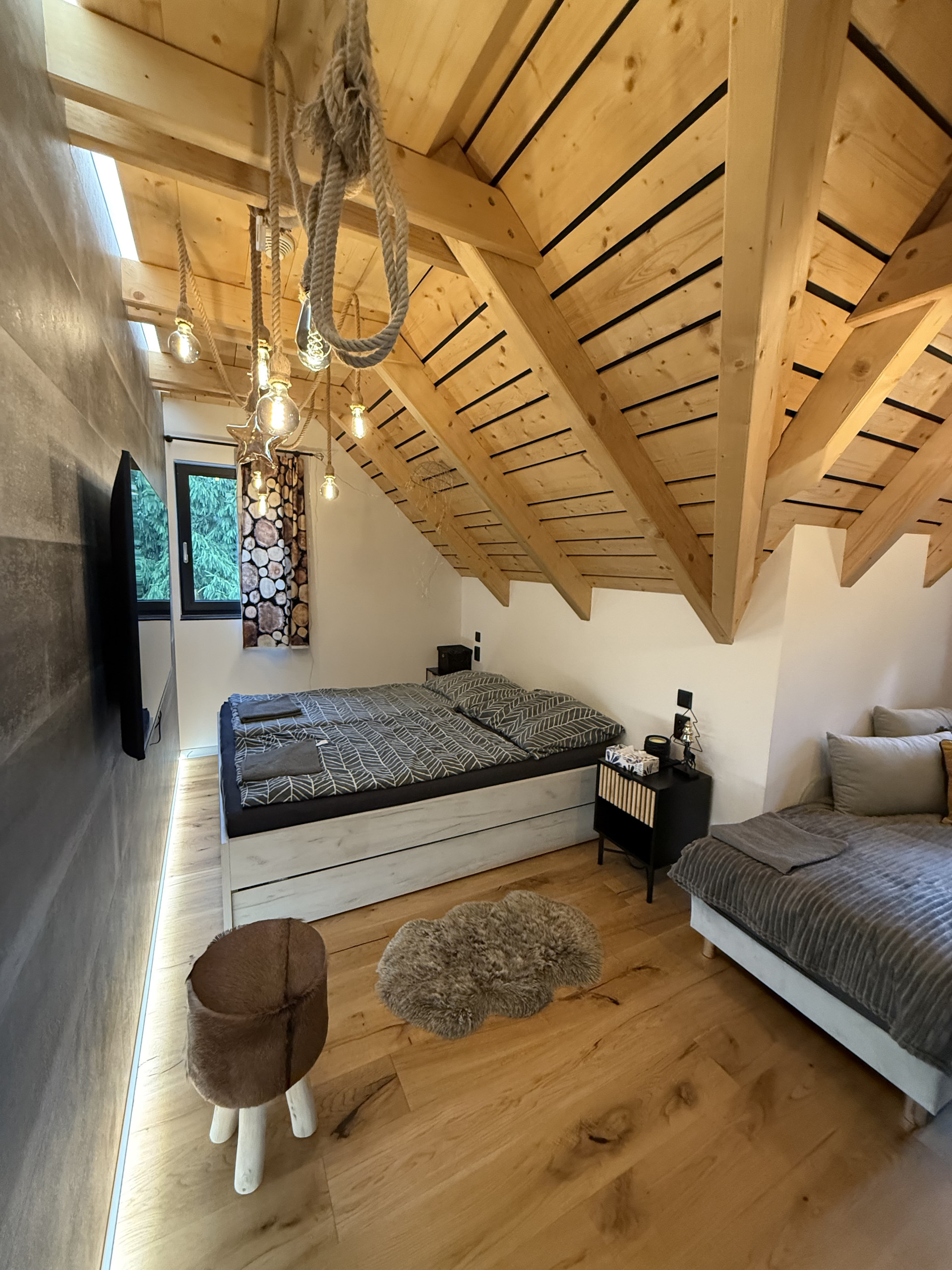 Inside, there are four stylish bedrooms accommodating a total of 11 guests. The master bedroom on the ground floor is quiet and offers plenty of privacy. On the upper floor, there are two bedrooms, each with a double bed, one of which also has an extra bed. In the loft above the living room, four single beds are arranged in an open space. For larger groups, the sofa bed in the living room can host additional guests, allowing up to 12 or 13 people to stay comfortably. All bedrooms are equipped with a TV.