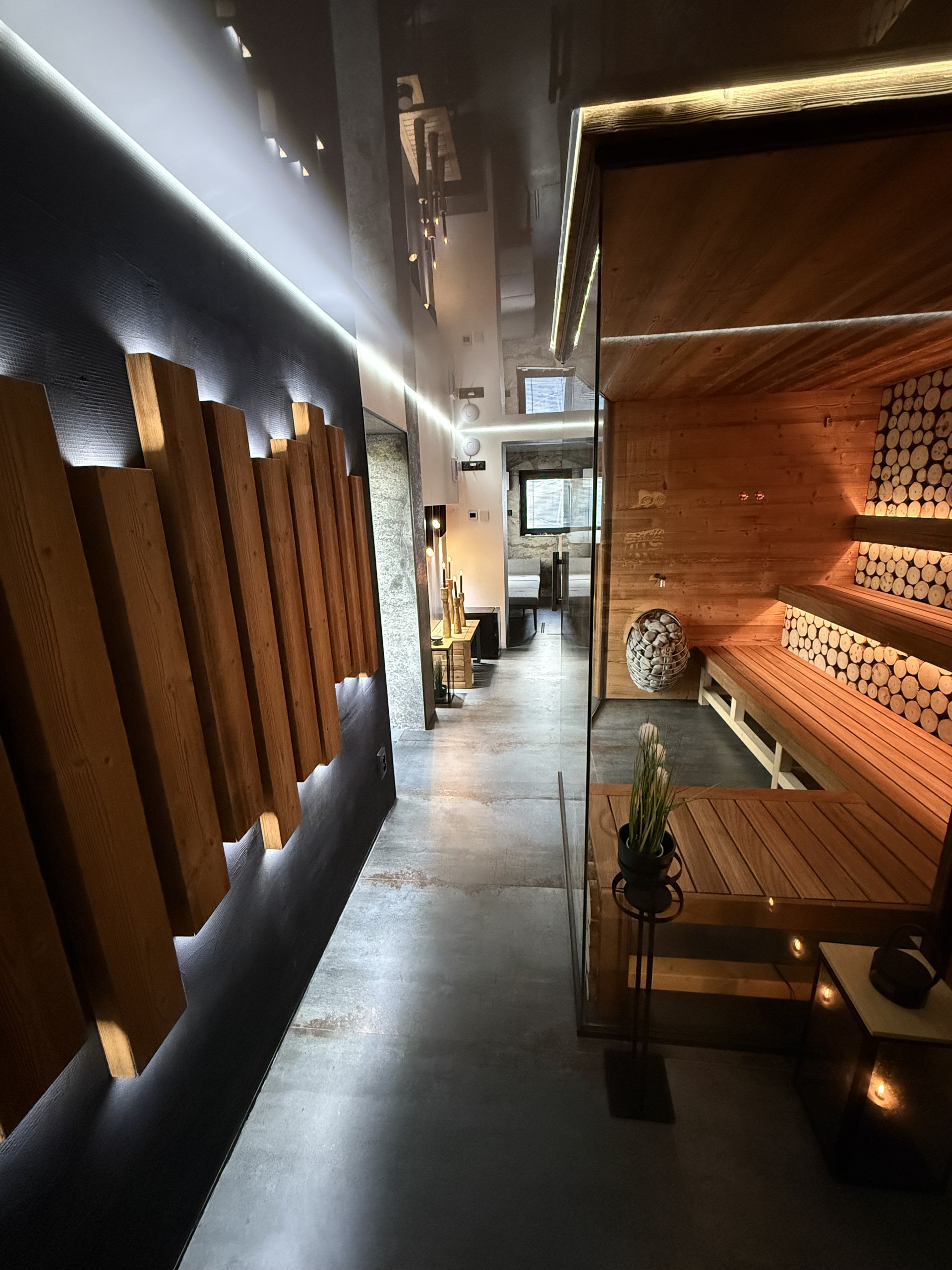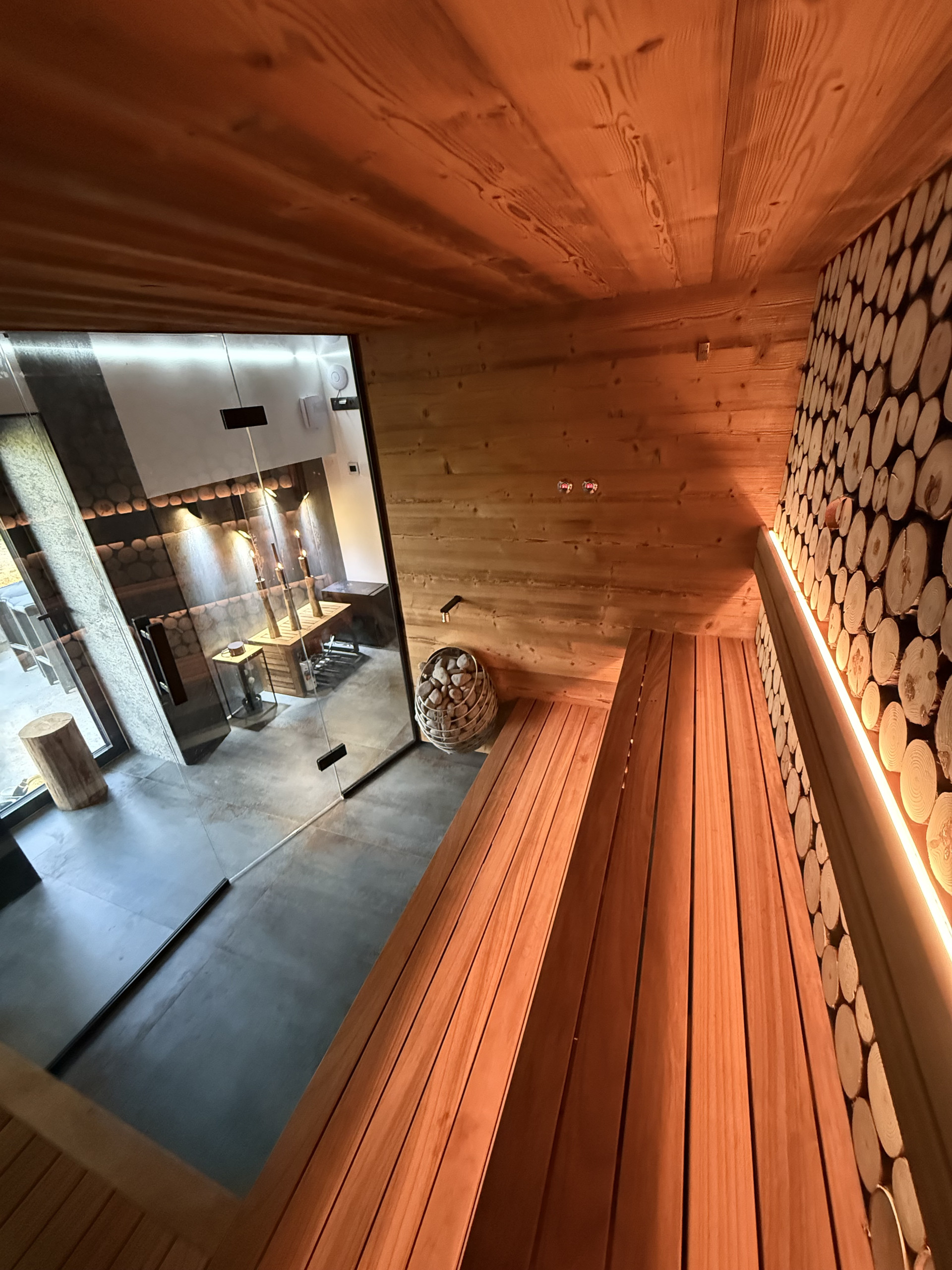 The villa has two modern bathrooms with designer showers, one located directly next to the Finnish sauna. The ground-floor wellness area features a spacious 2.1 x 2 m jacuzzi with massaging jets, ambient lighting, and a waterfall. Electric underfloor heating, a designer fireplace, and a bio-ethanol fireplace provide extra warmth and atmosphere.
