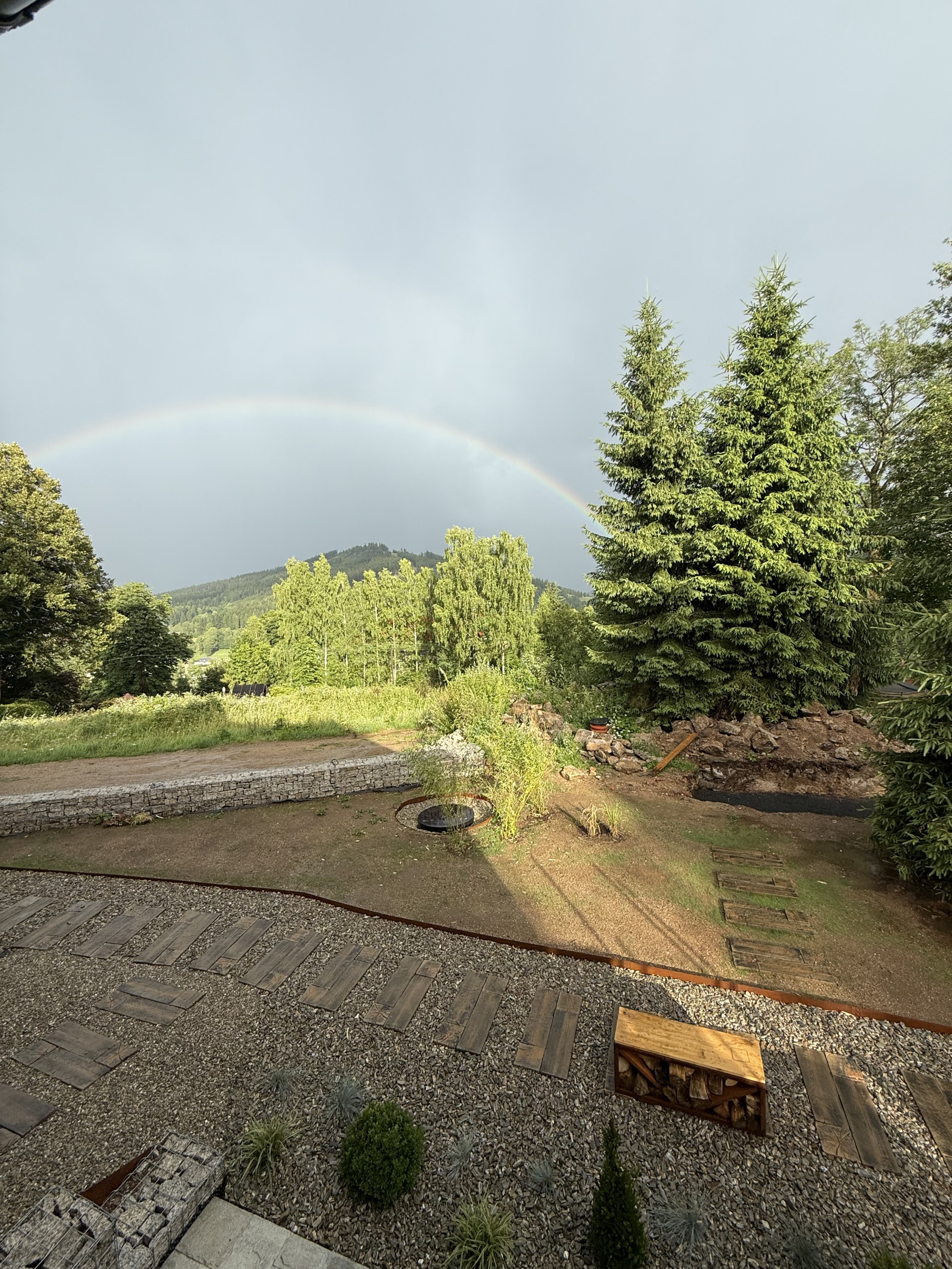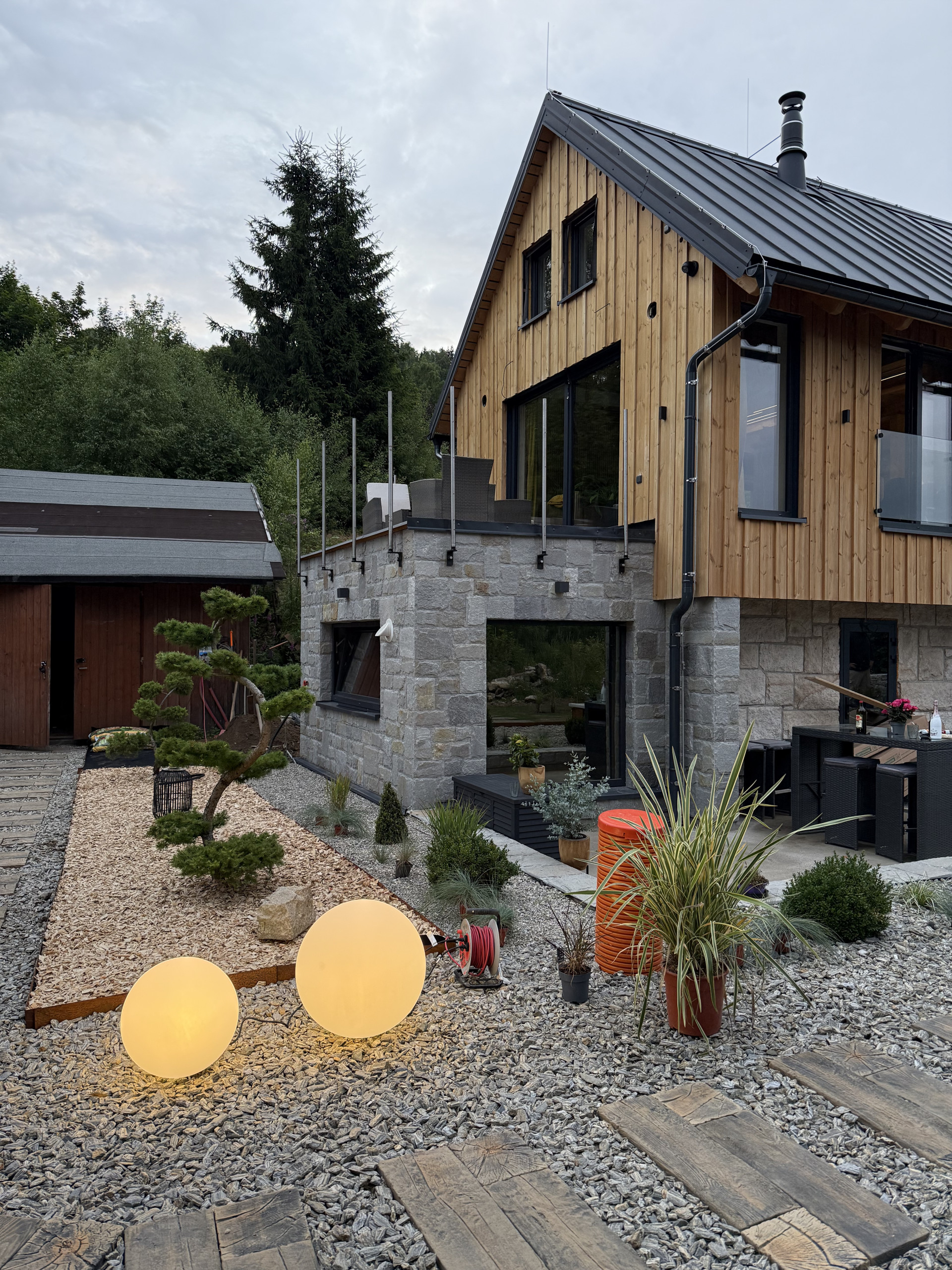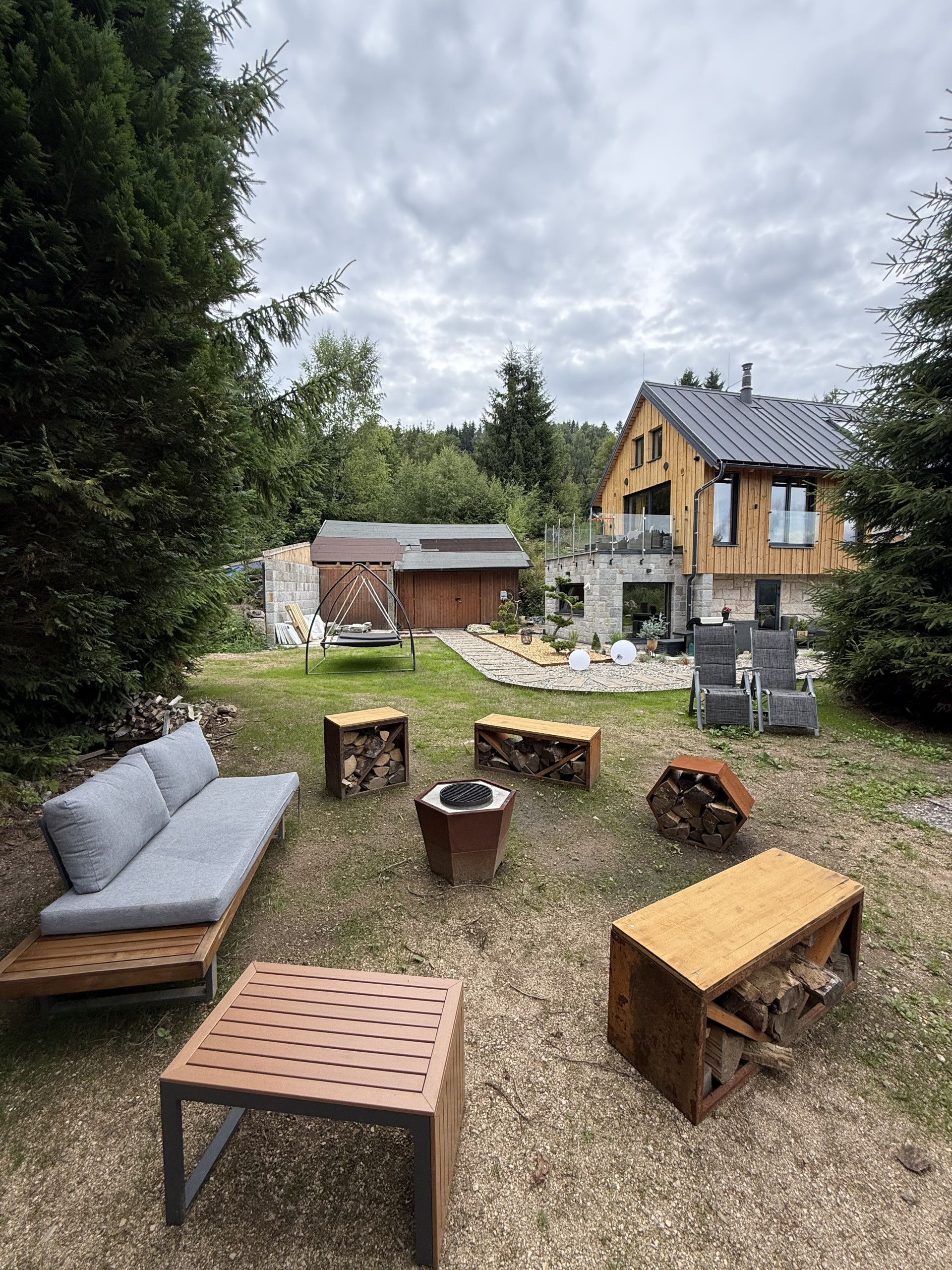 The fully equipped kitchen is perfect for cooking together. The living room is a comfortable place to relax, with a large TV with Netflix and high-speed Wi-Fi available throughout the house. Outside, there are multiple seating areas, a corten steel open fireplace with barbecue, and a sunny garden where you can enjoy the fresh mountain air.