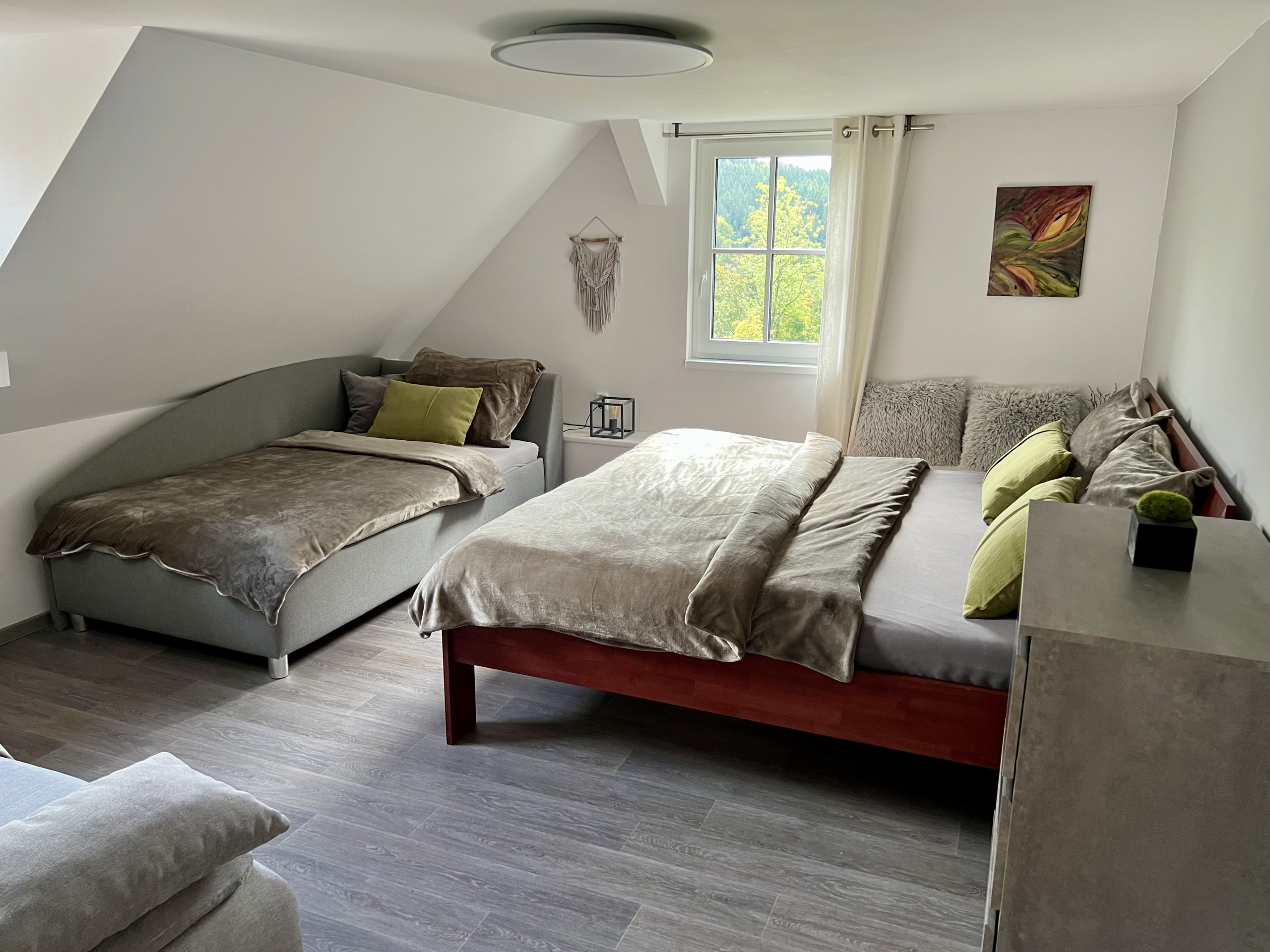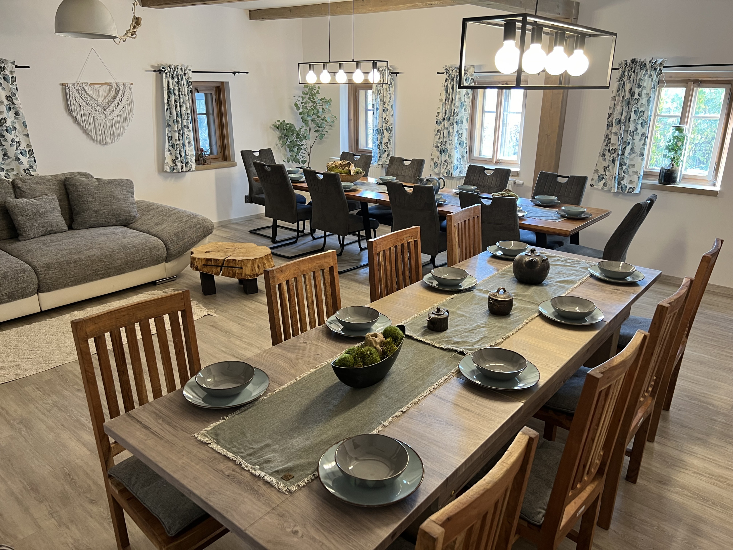 It's built by a small road at the edge of a steeper hill, offering a large garden, cool private view of the beautiful nature in the valley and many fun amenities - outside jacuzzi fire-wood bucket, grill area, playground for kids, inside sauna and jacuzzi, kitchen and large dining/social area, various bathrooms and smaller rooms and multiple bedrooms on the second floor. The third floor is an apartment where the owner lives and she may be there during your stay. Everything is modern and well-decorated (the desk below the sink made from a real tree is super cool!) and the cabin has everything you may ever need. The price for a weekend stay is a bit steeper, but if there's a group of 12+ people, it's actually pretty okay for what you get. All in all, a really beautiful place offering a lot if you want to partyjust relax with a larger group of friends, familycolleagues. |