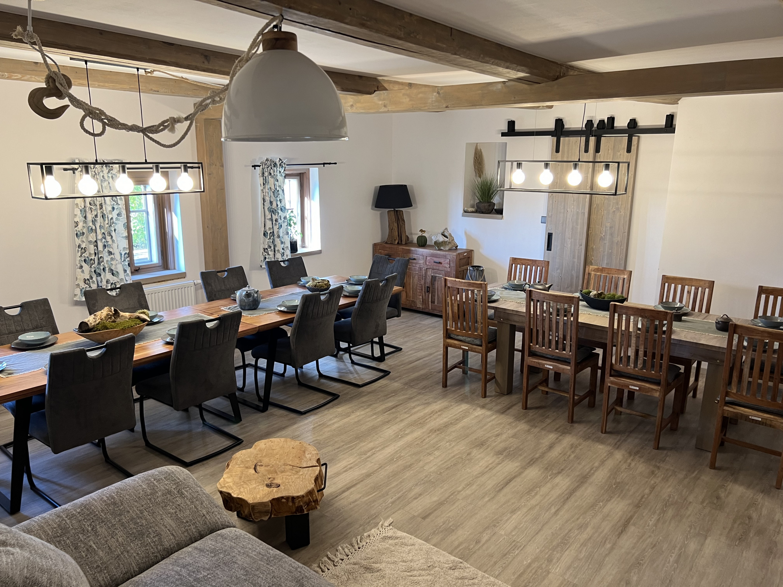 Outside, relaxation and fun await: a large terrace with pergola, a grill for culinary delights, and a charming fire pit. Children can enjoy the inground trampoline, playground equipment, and spacious garden, while sports enthusiasts can play volleyball, badminton, football, or petanque. Everything is designed for both shared enjoyment and peaceful relaxation in nature.