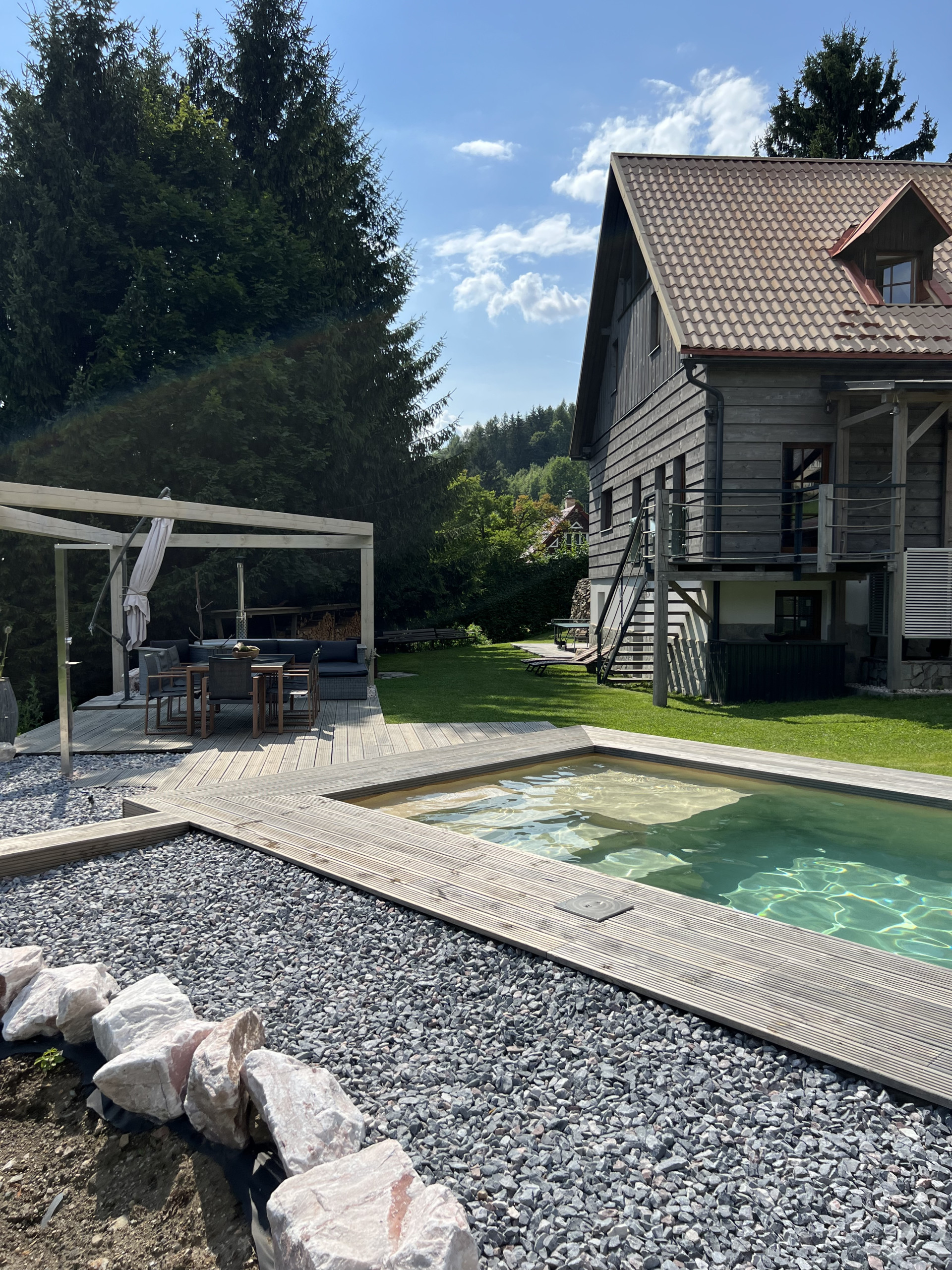 Ddvě vířivky,sauna, bazén, hřiště,houpačka, trampolína,grily...V krásném okolí budete mít pocit, že nikam nemůžete odcházet,abyste si ji užili naplno.Jsme unešeni,...