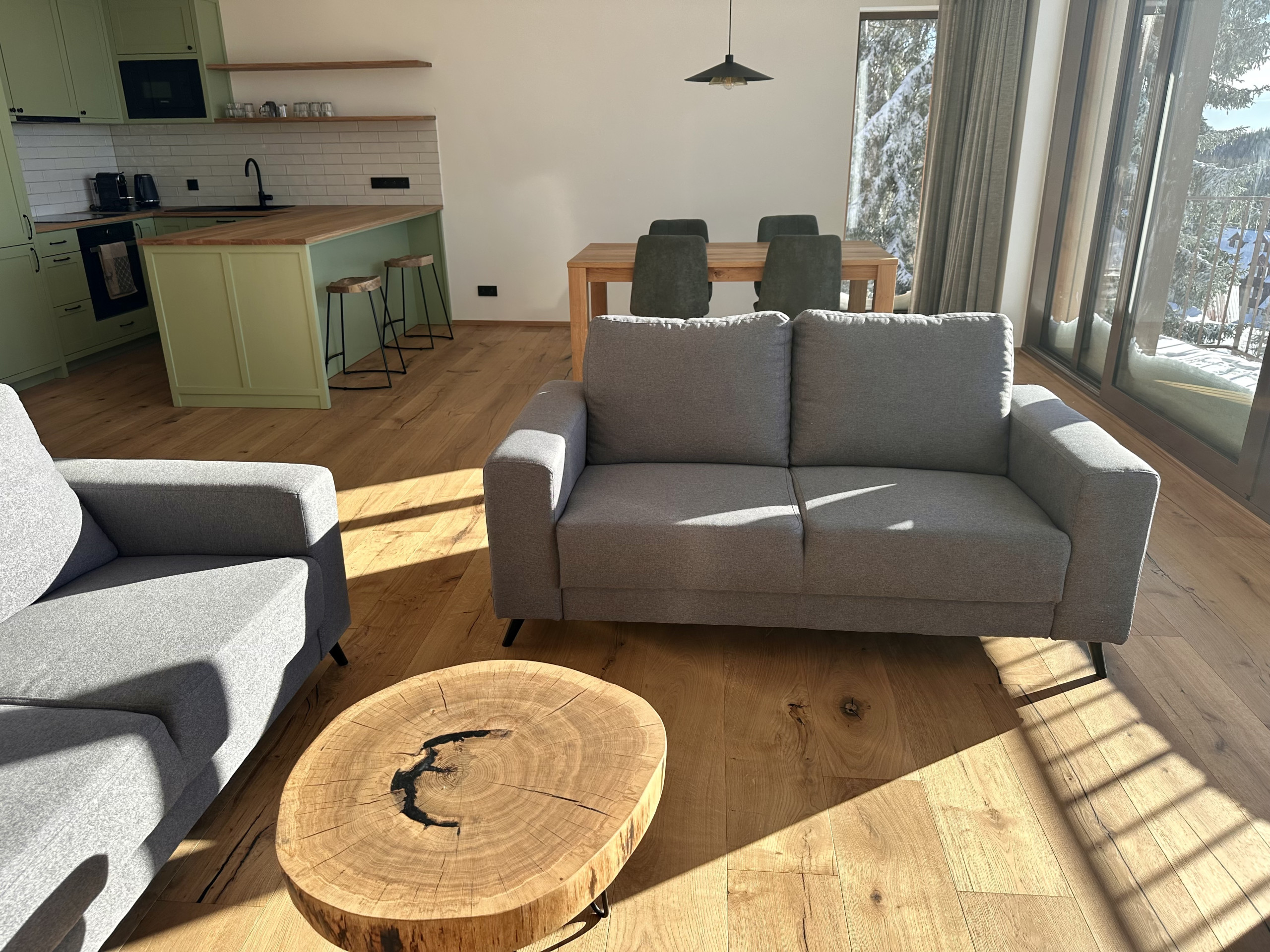 Each apartment is bright, spacious and stylishly furnished, featuring large windows and a balcony with mountain views. All apartments include a fully equipped kitchen with oven, dishwasher and Nespresso coffee machine, a generous dining table and a comfortable living area.