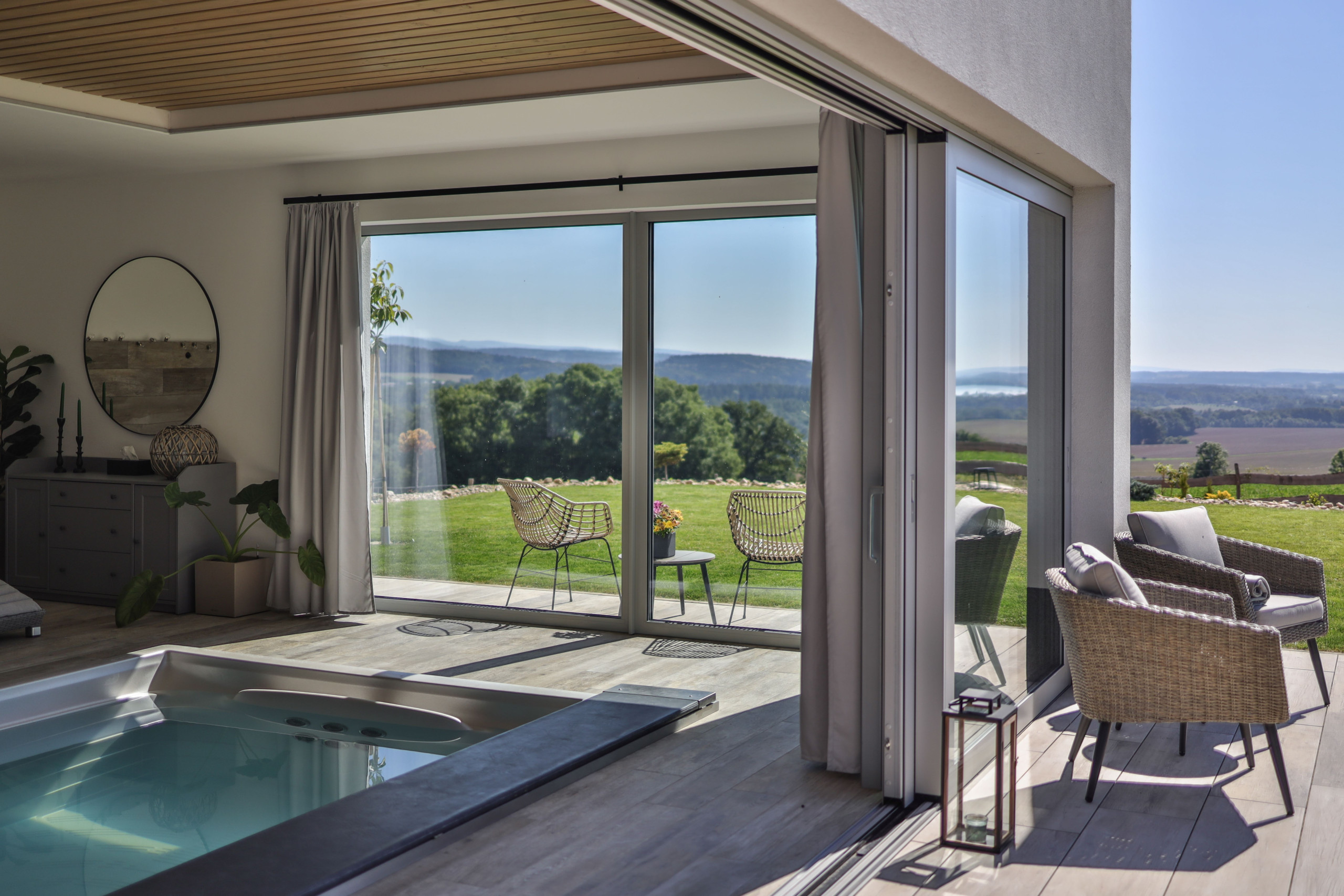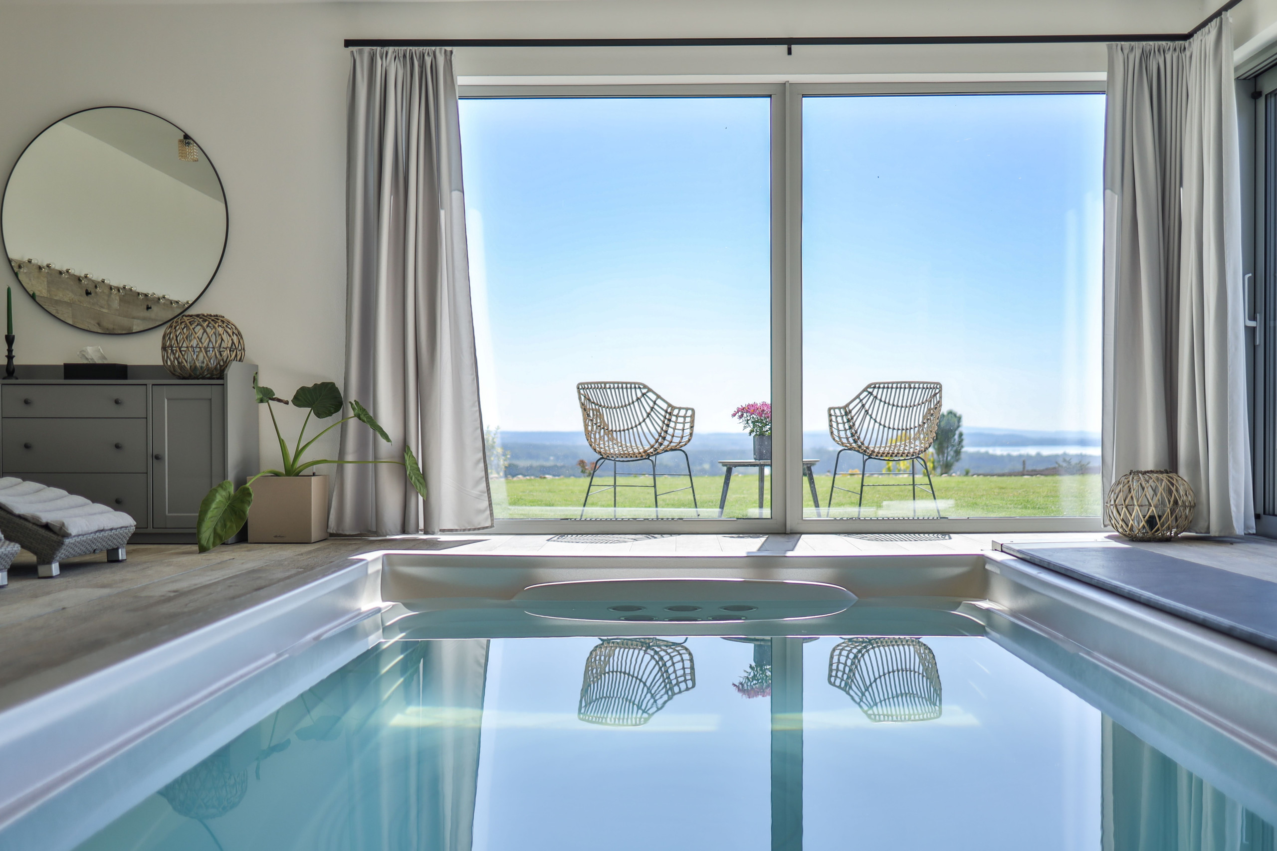 Inside, a wonderfully heated indoor pool with large glass walls awaits you, so you can enjoy the view all year round. Outside, a jacuzzi is ready whenever you are. And the sauna? Heat it up whenever you like. Everything is private and included in your stay.
