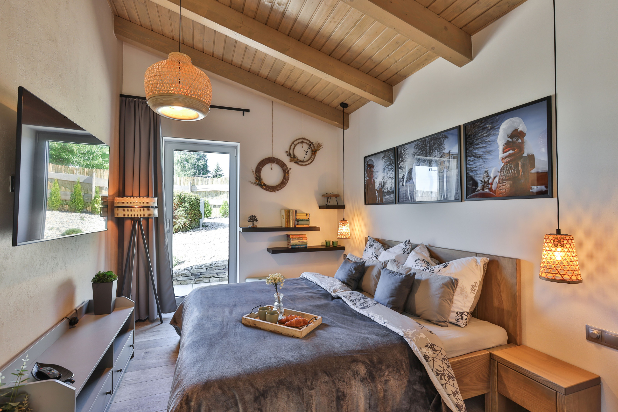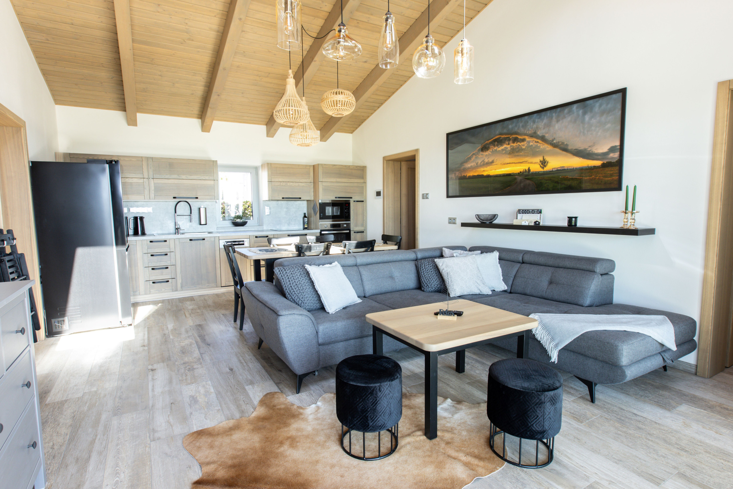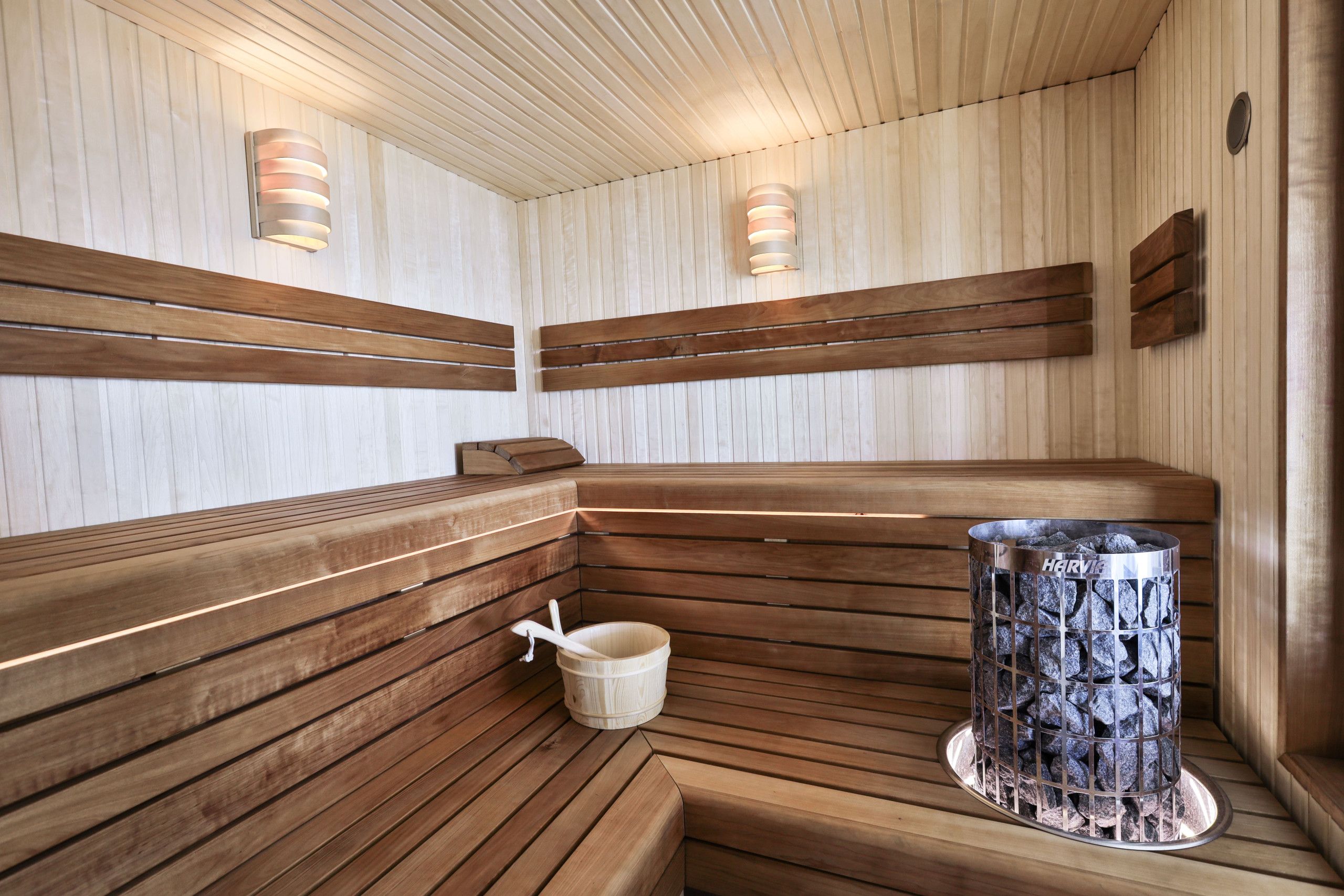 The wellness area connects directly to the living room and features a beautiful indoor pool (30°C), counter-current system, lighting and sliding doors you can open halfway in summer so the indoors and outdoors blend together. In the relaxation area you’ll find loungers, bathrobes, soft towels and sauna sheets, all included.