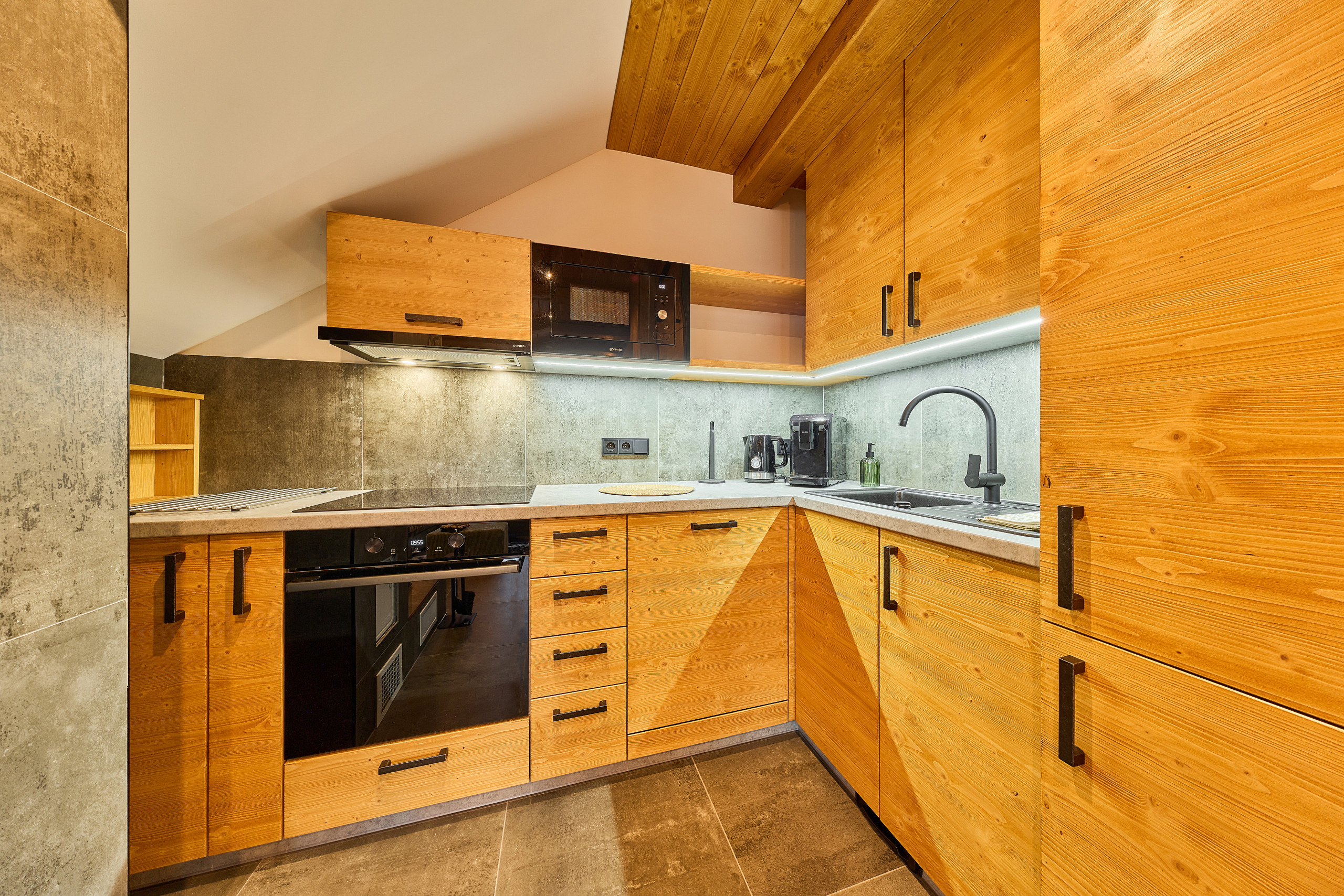 La cuisine indépendante, à induction, est équipée avec réfrigérateur, micro-ondes, four, congélateur, lave-vaisselle, vaisselle/couverts, ustensiles/cuisine, cafetière, grille pain et bouilloire.