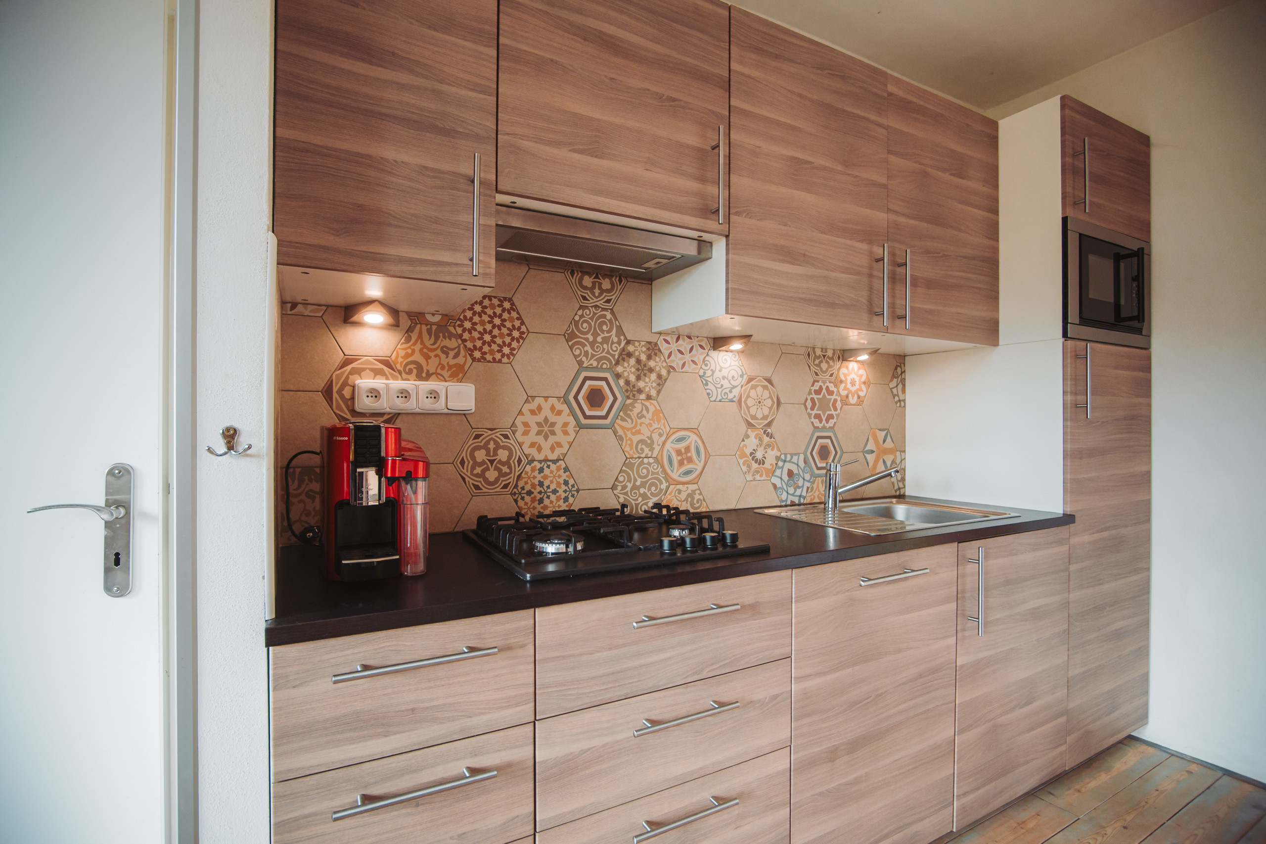 La cuisine, est équipée avec réfrigérateur, micro-ondes, lave-vaisselle, vaisselle/couverts, ustensiles/cuisine, cafetière et bouilloire.