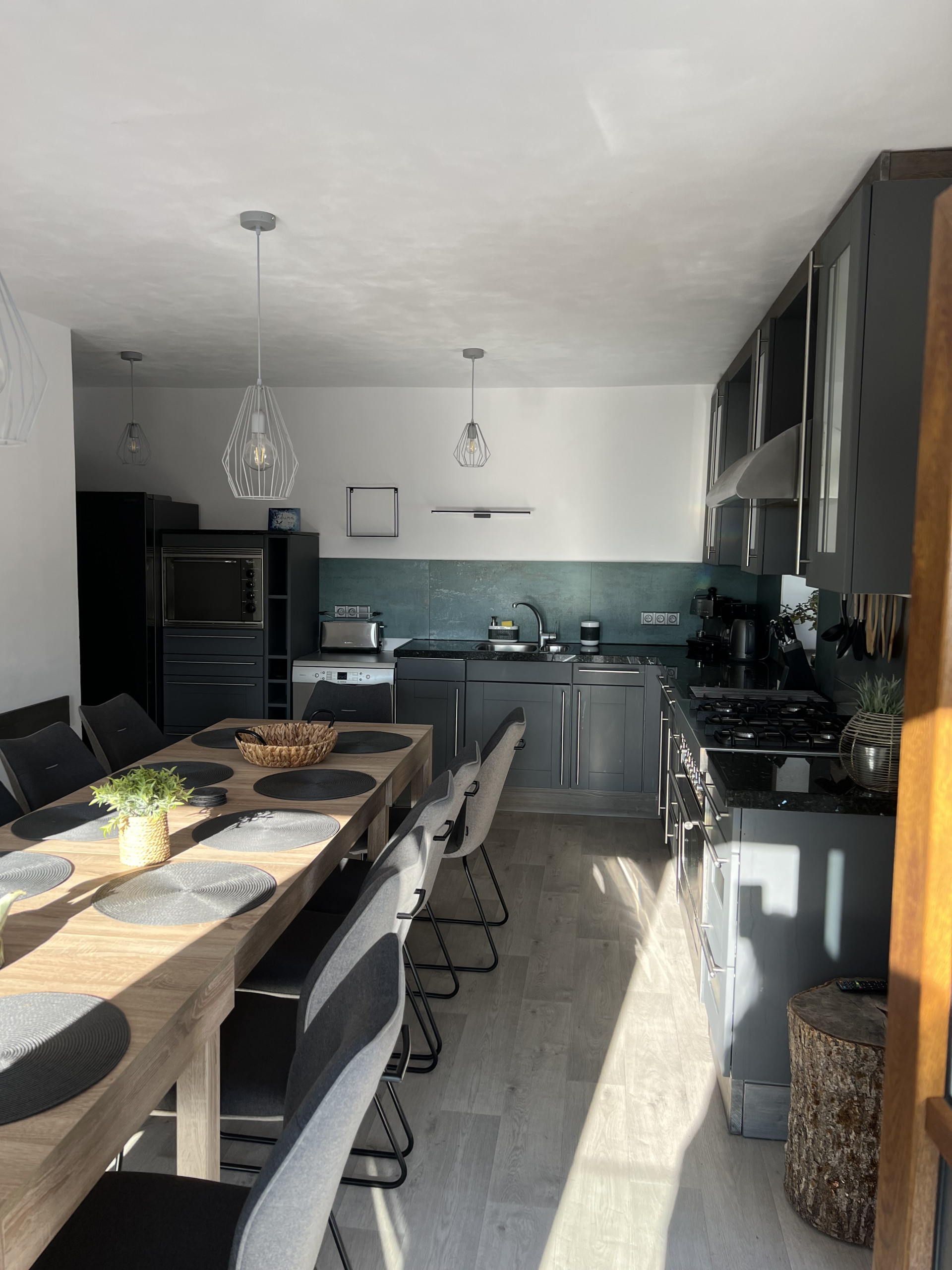 La cuisine, est équipée avec réfrigérateur, micro-ondes, four, congélateur, lave-vaisselle, vaisselle/couverts, ustensiles/cuisine, cafetière, grille pain et bouilloire.