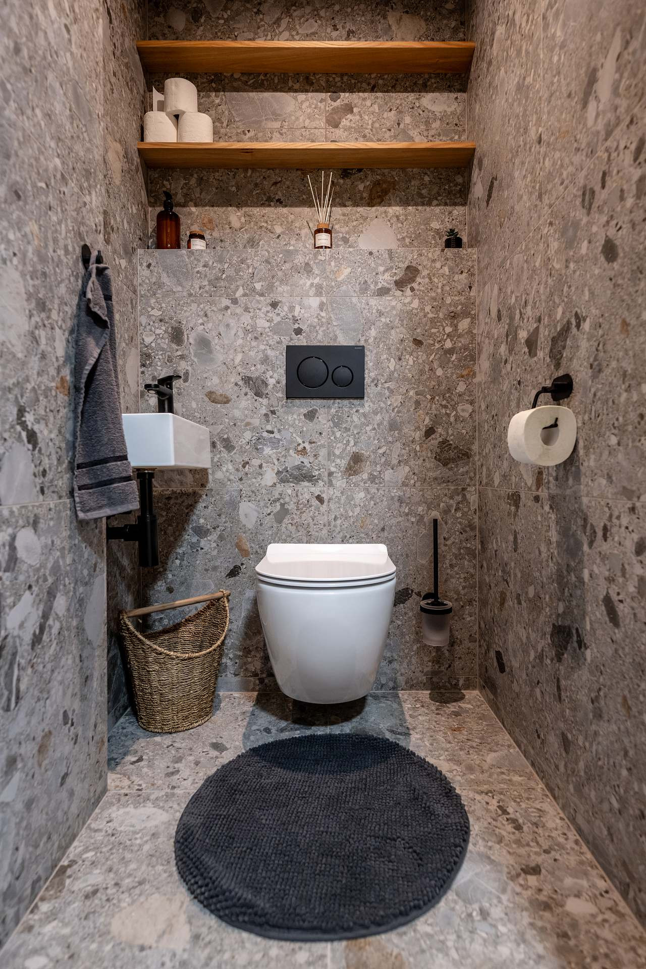 - Badkamer met douche, dubbele wastafel, WC en haardroger