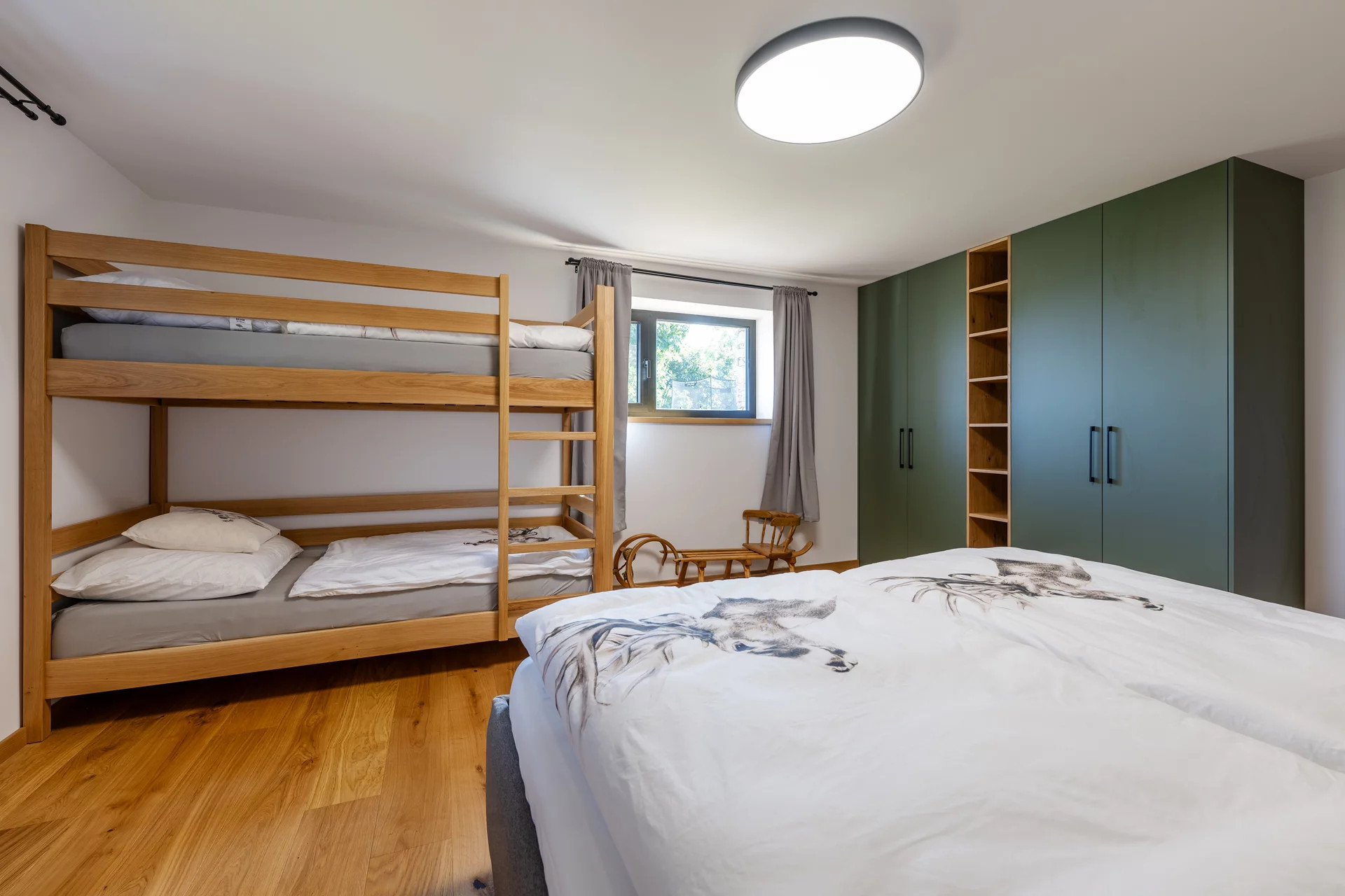 - Slaapkamer: 1 tweepersoonsbed en 1 stapelbed, kledingkast, nachtkastjes, beddengoed aanwezig