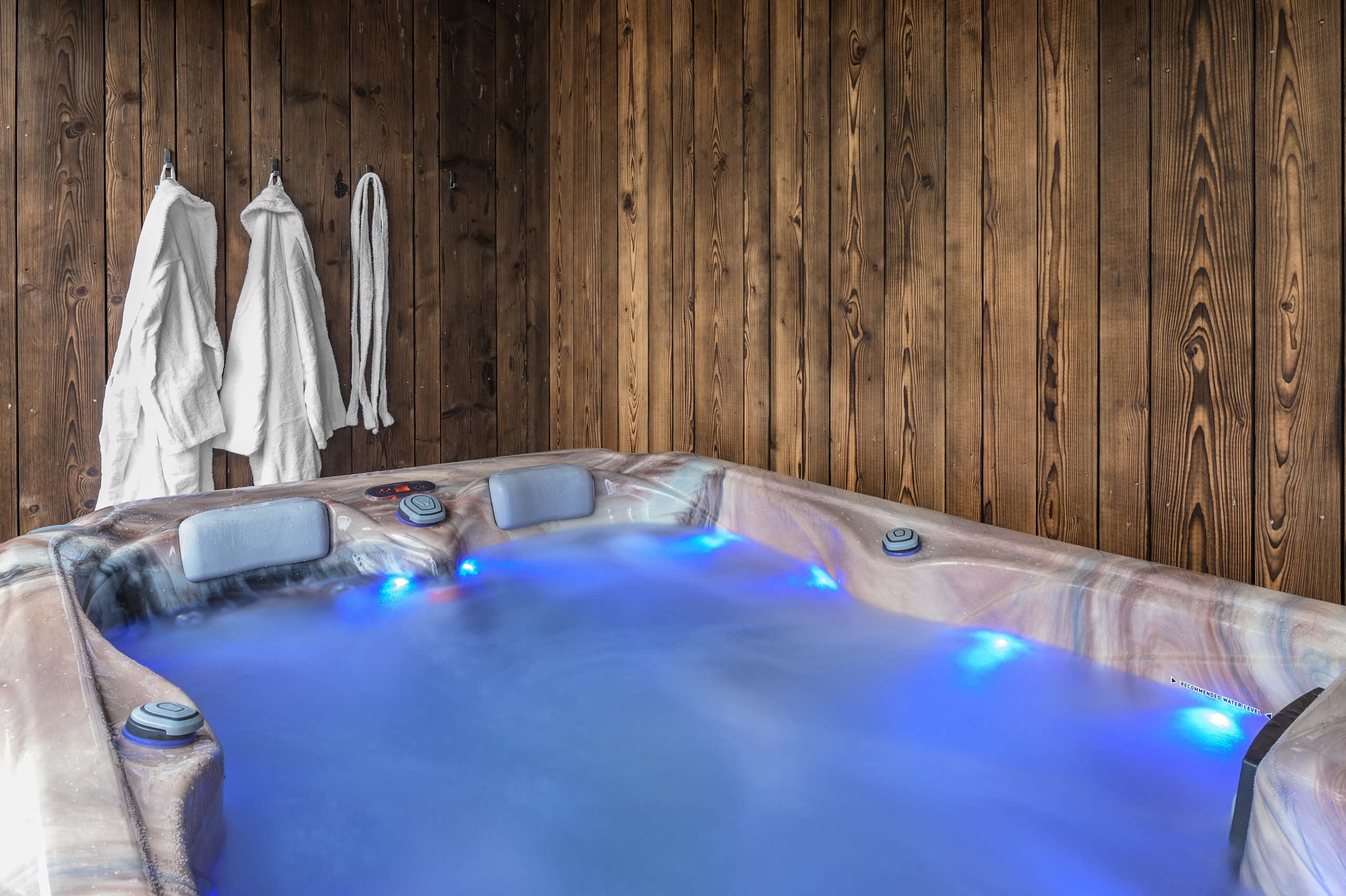 Ook buiten is het heerlijk. Rond het huis liggen verschillende terrassen, waaronder één heel bijzonder: gebouwd rondom een grote boom, wat een unieke sfeer geeft en fijne schaduw in de zomer. Verder is er een kleiner, knus “nest”-terras met uitzicht op de natuur, de perfecte plek voor een stille ochtend of een glas wijn in de avond. Het verwarmde zoutwaterzwembad is het hele jaar door te gebruiken, en de hottub is misschien wel het grootste cadeau na een dag wandelen of skiën.