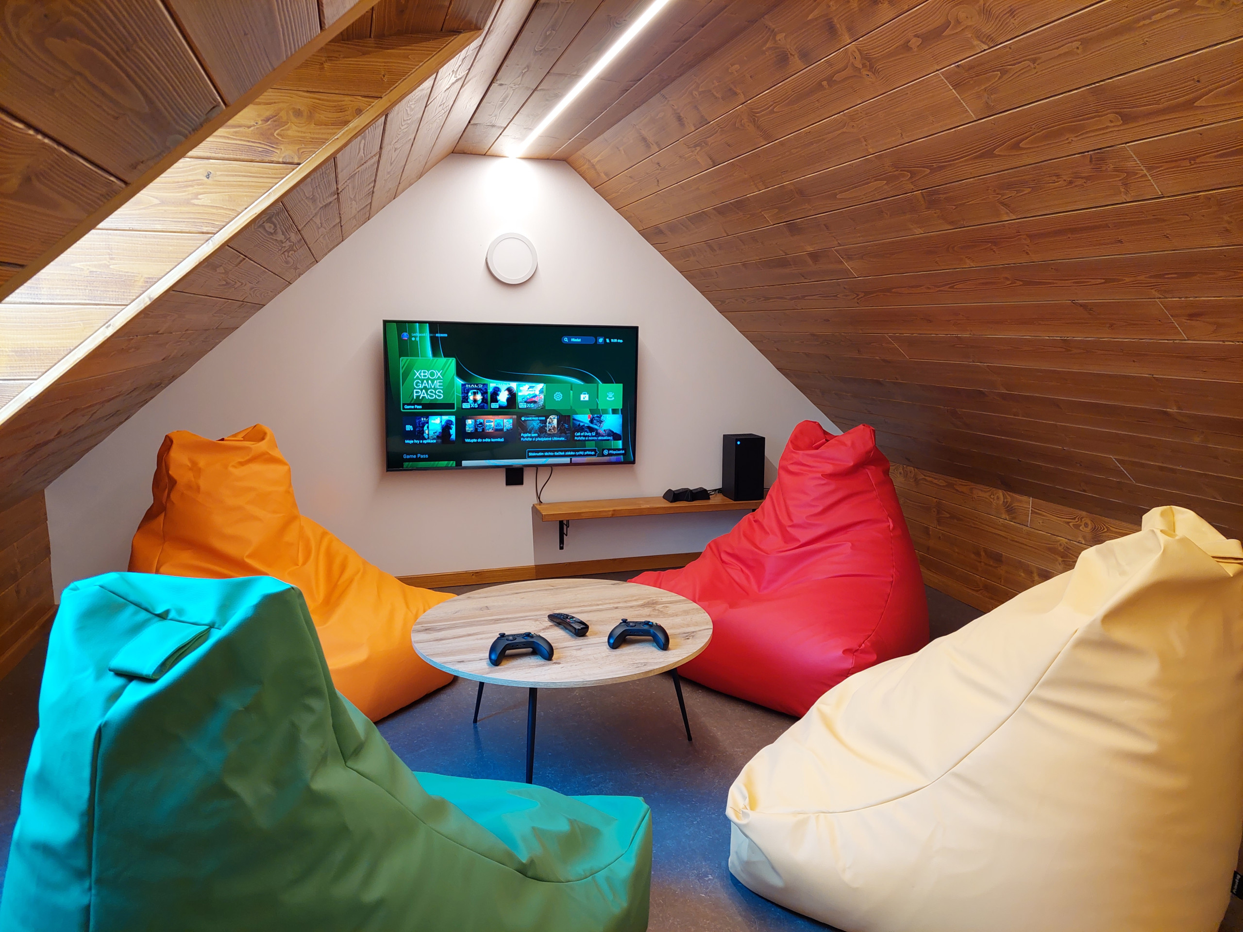 De zolder voelt bijna als een eigen speelhuis: een ruime relax- en gameroom met TV, gameconsole, zitzakken en zelfs een klimwand om naar boven te klimmen. Kinderen zijn hier uren zoet, en volwassenen eerlijk gezegd ook. In de technische ruimte kun je al je wintersportkleding, ski’s en skischoenen laten drogen voor de volgende dag.
