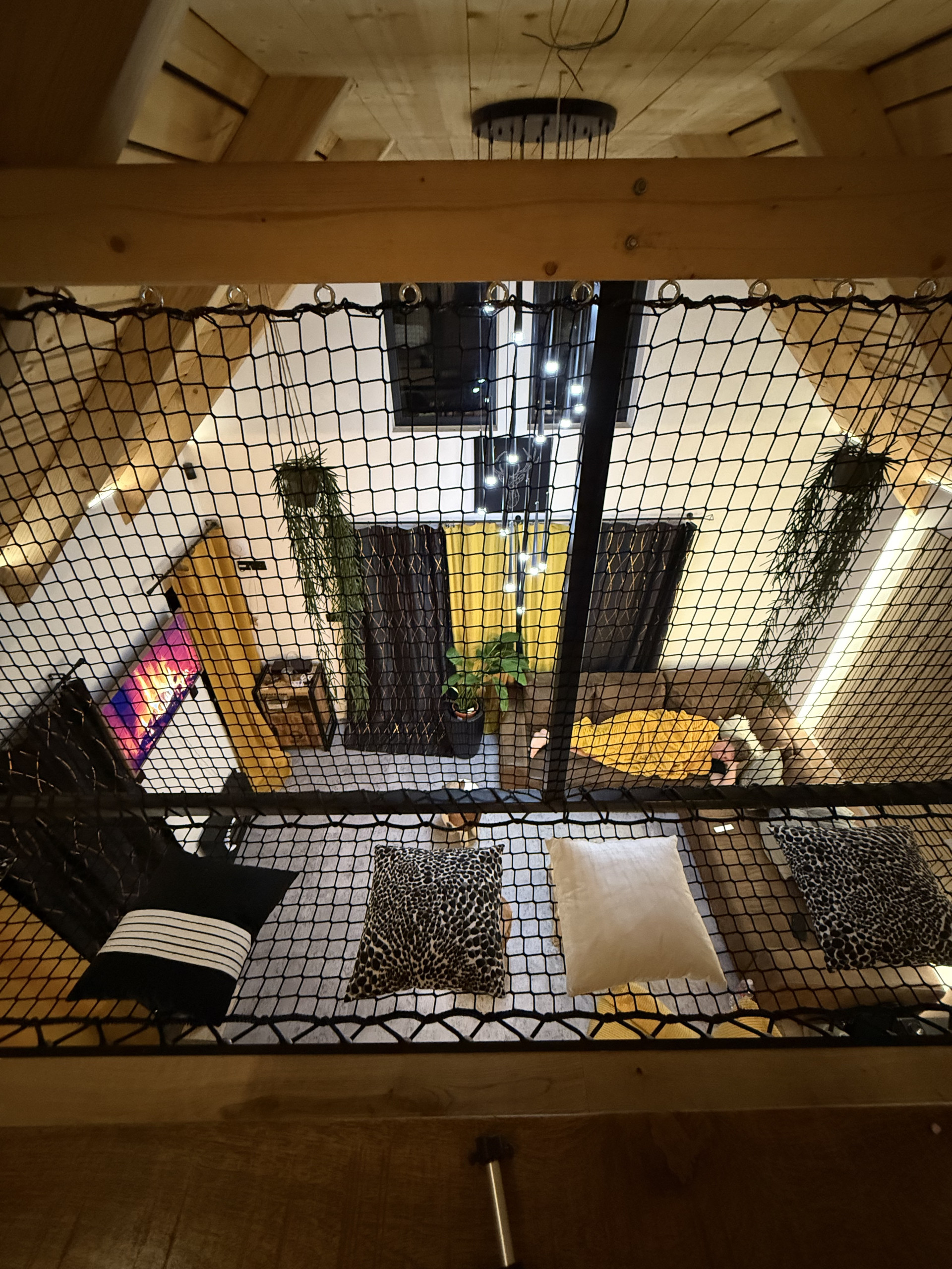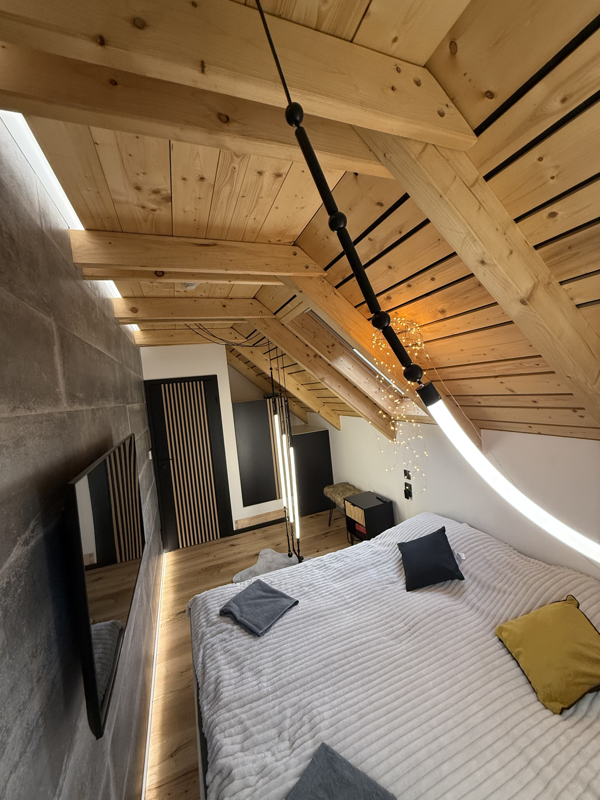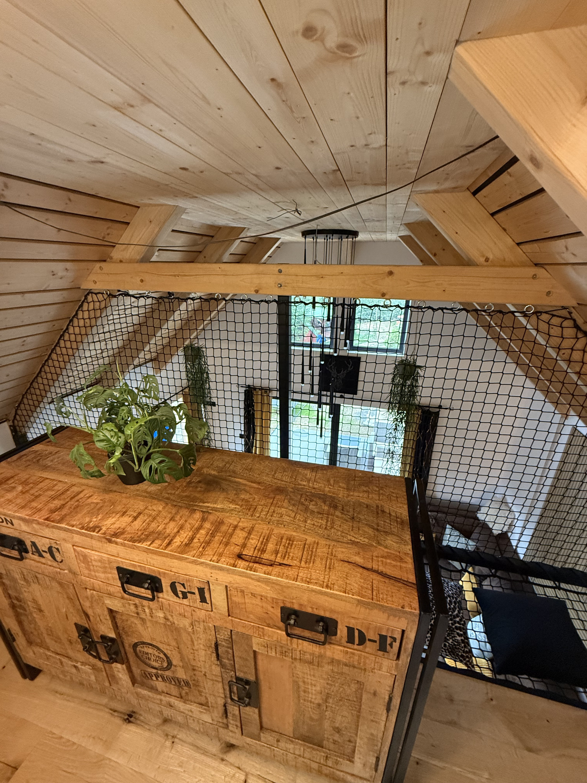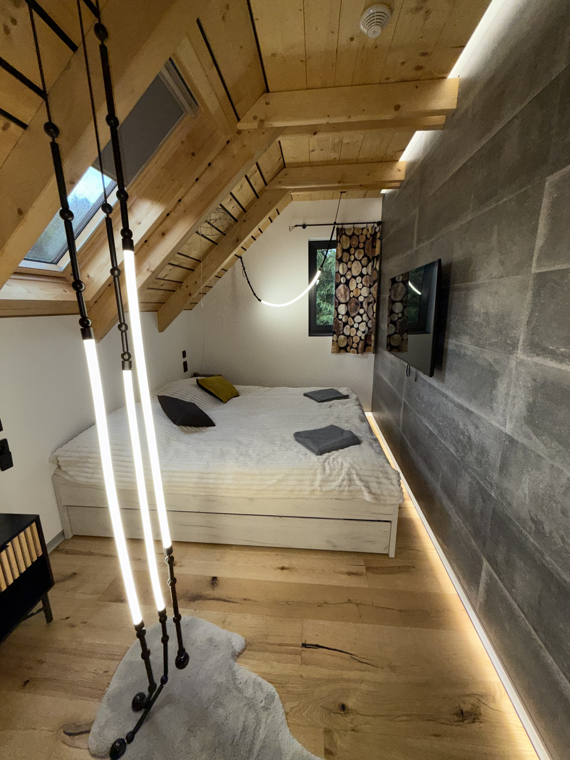 Binnen zijn vier stijlvolle slaapkamers met in totaal 11 slaapplaatsen. De masterbedroom op de begane grond ligt rustig en biedt veel privacy. Op de bovenverdieping zijn twee slaapkamers, elk met een tweepersoonsbed, waarvan één ook een extra bed heeft. In de loft boven de woonkamer staan vier eenpersoonsbedden in een open ruimte. Voor grotere groepen kan de slaapbank in de woonkamer extra gasten herbergen, waardoor zelfs 12 of 13 personen comfortabel kunnen verblijven. Alle slaapkamers zijn voorzien van een tv.
